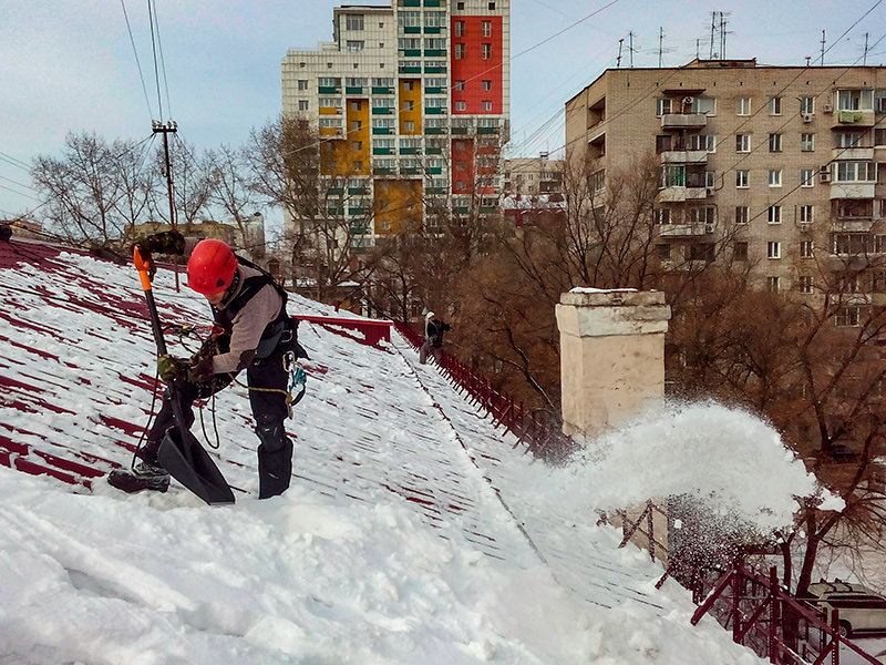 Очистка кровли от снега, наледи и сосулек — это опасная работа, требующая соблюдения строгих мер предосторожности: